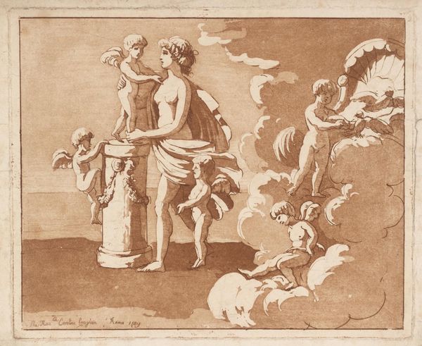 Editor: This is "Three Putti by a Vase," a pen and ink drawing by Jacob Ernst Marcus, likely made between 1784 and 1826. There's a really playful energy to it, almost chaotic, which I wasn't expecting from something neoclassical. What do you make of this scene? Curator: It's a whirlwind of cherubic activity, isn’t it? To me, the seeming chaos *is* the point, darling. Think of the 18th century and its fascination with recreating antiquity; but doing so through the lens of newfound freedoms! Marcus, here, captures a sense of unbound energy and uninhibited playfulness that runs absolutely contrary to the stiff, moralising art that was *de rigueur*! Note the confident, sweeping strokes, seemingly dashed off. Don’t you find something modern in the approach? Editor: Definitely. It feels much more dynamic and expressive than I typically associate with neoclassicism. That vase, though, is very classical isn't it? Curator: It is indeed! The vase, the *putti* themselves – they're nods to classical ideals. But look at their antics! They’re clambering, they’re poking... this isn’t some stuffy, allegorical scene; it is as though Marcus wanted to capture fleeting moments, and their sense of mischievous exploration! Now, notice how the light dances across their little bodies. Editor: It gives them a real sense of weight and volume, despite the simple lines. Curator: Exactly! The ink wash creates depth and texture that belies the limited colour palette. Jacob manages to convey emotion, a playful exuberance, using so few tools. Perhaps even mocking more labored work from his peers. Editor: That's so interesting. I guess I came in with a preconceived notion of neoclassicism being stiff and serious, but this drawing completely challenges that! Curator: Isn't it wonderful when a piece throws a wrench into our expectations? The real magic happens when we embrace those surprises, allowing ourselves to see beyond labels and find the genuine expression within the art, even – especially – when that playfulness speaks of an unbound freedom!