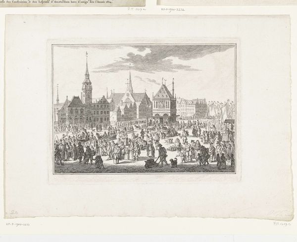 Curator: Standing before us is an etching by Nicolaas Barnouw titled "De komst van Z.M. Koning Willem II op het Raadhuis der stad Schiedam den 31 Julij 1846," or "The Arrival of His Majesty King Willem II at the Town Hall of the City of Schiedam on July 31, 1846." It's a Romantic portrayal of a public event, showcasing a moment of civic pride. Editor: It's fascinating. The crisp detail gives it a sense of realism, but the way the crowd seems to swell and converge, it has an almost dreamlike quality. Like a cherished, embellished memory. Curator: Precisely. What is interesting from a historical standpoint, is considering the public's perception of the monarchy at that specific time and how prints like these were instruments of power for shaping opinion, reinforcing allegiance in newly formed nations like the Netherlands. This image would have circulated widely. Editor: The symbols reinforce that reading. Flags are draped everywhere and the Town Hall practically glows in the center, a clear invocation of national identity and civic virtue. Also, I see a distinct hierarchy implied in the architectural placement of royalty, as almost god-like, elevated by being placed inside the town hall. Curator: And note the realism employed to showcase local identity: buildings typical of Schiedam flank the space around the city's town hall square, providing spatial context for the king’s visit. A subtle promotion of local pride. Editor: I also noticed how the composition subtly guides the viewer's gaze upwards to King Willem II, positioned almost centrally within the open space of the town hall, as if illuminated by divine light. It evokes a sense of hope for the future. Curator: A meticulously constructed piece of propaganda, wouldn't you agree? An invitation to identify with the burgeoning sense of Dutch identity in 1846, presented via a reproducible, marketable format. Editor: Indeed. Through careful use of imagery and implied narratives, the artwork functions almost as a community mirror. Looking at the visual elements tells us a lot about power relationships at play and cultural values. Curator: Thank you for illuminating the symbolism inherent in this cityscape. Understanding this Romantic portrayal also requires attention to the specific historical contexts that generated such an image in the first place. Editor: It makes you wonder what values we choose to project, consciously or not, in the artworks of our own era.