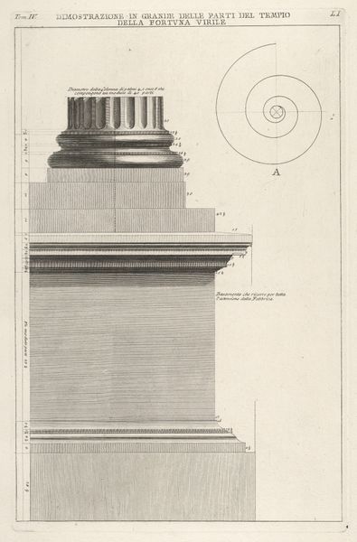 Editor: This engraving by Giovanni Battista Piranesi, titled "The Roman antiquities, t. 4, Plate LI. Vista in large parts of the Temple of Fortuna Virile," really showcases incredible detail, focusing specifically on the architectural elements. It feels very technical, almost like a blueprint, but with a clear artistic intention. What jumps out to you when you look at this? Curator: The etching embodies a deep engagement with the processes and labor embedded in architectural representation and the making of buildings in general. It moves beyond simple documentation, interrogating how architecture functions both materially and as a cultural construct. Note how the materiality of the built form – the very stones and construction methods – are placed front and center, challenging conventional fine art boundaries. Editor: So it's about more than just the beautiful temple; it's also a social commentary on its creation and the materials? Curator: Precisely. It probes into who built it, using what resources, and what the implications were. The print itself is also an object of labor, from its initial concept to distribution and, ultimately, consumption. It’s crucial to consider this print not as a mere aesthetic artifact, but as a testament to these historical processes. Does it challenge our preconceptions about "art"? Editor: It definitely does. I initially saw just a historical document, but understanding the materiality and the social aspects adds another layer. Curator: Seeing it through a materialist lens makes you consider the social, economic, and political conditions necessary for the production of both the temple and this printed image. How labor, consumption, and ideology play critical roles. Editor: I see that now. Focusing on the materials really highlights that interplay. Thanks, this has definitely expanded my perspective on art interpretation.
