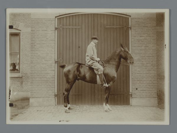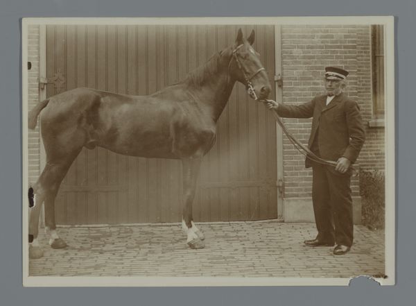 Editor: This gelatin-silver print, “Het paard Bobbie met man aan teugel voor de schuur,” or "The horse Bobbie with man at the reins in front of the barn," made around 1896 by Hendrik Herman van den Berg, has this strikingly formal feel. It feels staged and proper, almost like a family portrait. What do you see in it? Curator: It’s precisely that "staged and proper" feeling that strikes me, too. Pictorialism in photography at that time sought to elevate photography to the status of fine art, emulating painting. The formal arrangement, the subject matter - it’s all constructed to be perceived in a very particular way. Consider how this photo was initially presented: was it in art galleries, photographic salons, or even circulated amongst a local community to document property or family wealth? These factors would influence how it was initially understood and valued. Editor: So, its presentation influenced its value? In what way? Curator: Absolutely. A photograph presented in a gallery challenges notions of photography's inherent connection to realism. Suddenly, we're prompted to think about composition, artistic intent, and the artist's role, rather than pure documentation. Was Van den Berg engaging with artistic photography, perhaps submitting this image to salons, to demonstrate his artistic skill, or fulfilling a more practical commission? This information shifts our understanding. Editor: That’s fascinating, considering the equipment was fairly novel back then! How would an art piece such as this have influenced or affected Dutch society at the time? Curator: This image could serve a social purpose as much as an aesthetic one. It immortalizes both the animal and its handler, suggesting a particular relationship to land and labor. These images help us to reconstruct a specific time, place and class dynamics through material culture. It gives rise to new interpretations, too! Editor: Thanks, I hadn’t considered its value in a societal context before. Curator: Indeed, thinking about where images circulate, who they depict, and what they signify beyond the immediate frame always provides invaluable context.