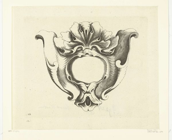Curator: Let’s turn our attention to this elaborate design titled "Cartouche Surrounded by Volutes." It’s attributed to Gabriel Huquier and dates to between 1710 and 1772. The piece is an engraving, demonstrating the linear precision characteristic of baroque printmaking. Editor: My eye is immediately drawn to the empty space in the cartouche. It's just begging to be filled, isn't it? Like a stage waiting for the drama to begin. The surrounding volutes feel almost… edible, like swirling cream on a fancy dessert. Curator: That emptiness is, of course, the point. Such cartouches would have been models for craftsmen in a range of disciplines. Consider the interior as space for coats of arms, monograms, or some form of allegorical imagery, adapting this general pattern. Editor: So, this wasn’t the final form, just an invitation? Still, all that meticulous detailing – the leaves, the scrolls – feels a little overwrought. It's impressive, but it seems to stifle the imagination, dictating the very ornamentation it's supposed to inspire. Curator: Consider this piece as part of a broader historical context, where the display of power, authority, and refined taste was absolutely everything! Decorative engravings circulated as blueprints, standardizing a visual language throughout elite society and the artisan classes. Editor: A visual instruction manual, indeed. There is something cold in that standardization. Though, the artist clearly delighted in the sinuous lines, that tension between rigid framework and almost delirious embellishment is definitely alluring. Curator: Absolutely, the inherent push and pull of a carefully delineated object intended for varied individual adaptations... It underscores the interesting contradictions of the baroque period, which this piece perfectly represents. Thanks for lending a fresh eye. Editor: It's been my pleasure. All that’s left for me to do is go in search of an equally Baroque patisserie and design some volutes of my own.
