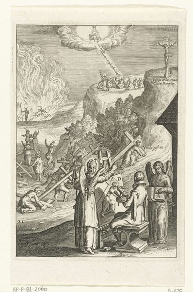 This emblem, crafted by an anonymous artist, presents a densely populated allegorical landscape rendered through engraving. The composition is structured around a central path, laden with figures bearing crosses, leading upwards towards a celestial realm. The artist employs intricate linework to distinguish between earthly struggles and divine promise. The rigorous, almost geometric arrangement of figures and symbols invites semiotic interpretation. Each character with their cross may signify a different form of worldly adversity. This visual encoding reflects the broader philosophical concerns of the period, where earthly existence was viewed as a procession of trials towards spiritual enlightenment. The act of carrying the cross, a heavy wooden structure, becomes a signifier for personal endurance. Note how the upward trajectory leads the eye to the lighter, cloud-filled region, symbolizing hope and salvation. This emblem functions not merely as an aesthetic object but as a complex philosophical statement about the human condition. It acknowledges the adversities we face and also the potential for transcendence through faith and perseverance.