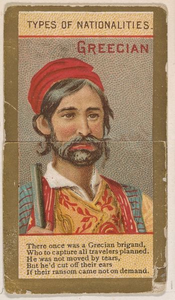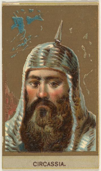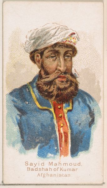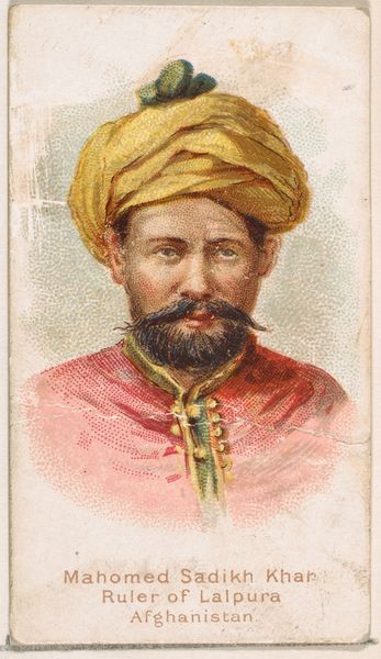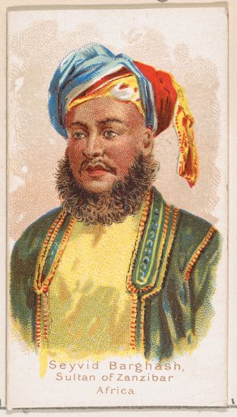 This small chromolithograph of Bagwan Sing, Maharaj Rana of Dholpore, India, was issued by Wm. S. Kimball & Co. Note the symmetry in the figure's pose and the balanced use of color. The bright reds and blues of his adornments sharply contrast with the muted greens and golds of his robe. The composition is vertically oriented, framing Sing's figure tightly, which draws us into his gaze. The formal elements here—color and composition—can be interpreted within a larger cultural context. The vibrant colors and detailed ornamentation may signify Sing's status and power, yet this card was part of a series titled ‘Savage and Semi-Barbarous Chiefs and Rulers.’ The structural juxtaposition of these visual markers with the derogatory title creates a tension, destabilizing the established Western perceptions of non-Western leaders. Consider the role of the viewer in completing this act of interpretation, as the artwork functions as a cultural signifier.