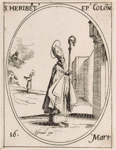 Carlo Lasinio created this print titled "Koekverkoper" using etching, a technique that allows for fine, detailed lines. The composition is structured around a central figure, the seller, who is framed by architectural elements on either side. Lasinio's strategic use of line and form creates a sense of depth and space. The architectural backdrop provides a structured environment that both contains and highlights the figure. Light and shadow play across the surfaces, delineating form and adding a sense of realism. The buildings in the background are less defined, suggesting distance and atmospheric perspective. The etching's formal qualities are not just aesthetic but also communicate cultural values related to work, commerce, and urban life. The seller becomes a focal point through which viewers can consider the broader social dynamics of the time. The image invites ongoing interpretations about the relationship between individuals, their occupations, and their place within the structured environment of the city.