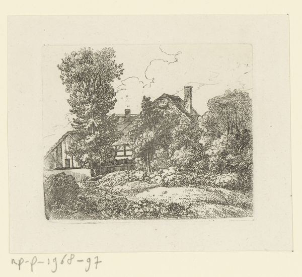 Curator: This etching, titled "Boerderij aan het water", which translates to "Farm by the Water," is attributed to Willem de Zwart, and it's thought to have been created sometime between 1872 and 1931. Editor: It evokes a very somber mood for me. The monochrome palette and the delicate lines almost feel like a memory fading, or a place slowly succumbing to time. There's a distinct sense of melancholy, wouldn’t you agree? Curator: Definitely. The stillness of the water and the almost ghostly quality of the farmhouse contribute to that feeling. The vertical poles remind me of totems and perhaps indicate connections with both the earth and sky. Perhaps this reflects an enduring symbol of Dutch resilience amidst changing social conditions? Editor: It might also hint at a societal structure under pressure, considering the shifting socio-economic landscape during that period. Agrarian life was romanticized but also becoming less viable for many families. It's a poignant look at labor and class. Curator: I'm also intrigued by the artist’s choice to depict this particular farm. It’s not idealized, like some Golden Age landscapes. De Zwart seems to focus on its everyday, lived-in reality, with an unromanticised view. I think we can read this image as capturing how Dutch society viewed nature, and the home. Editor: Absolutely. The work’s materiality contributes to its message. The choice of etching lends itself well to expressing those subtler aspects of societal change. We see what the changing landscapes means to the family, its people and community. Curator: The reflections in the water almost give the farm a transient feel, like it's about to dissolve, reflecting the ephemeral nature of life itself. Editor: It encourages us to examine not just the physical appearance of the farm but also the intangible weight of tradition, loss, and how the art becomes a quiet critique of modernization’s impact on rural communities. Curator: That’s a beautiful observation, placing a traditional symbol inside social anxieties. Editor: Indeed. What seems at first glance like a simple etching unfolds into a deeper consideration of its people, and their changing world.