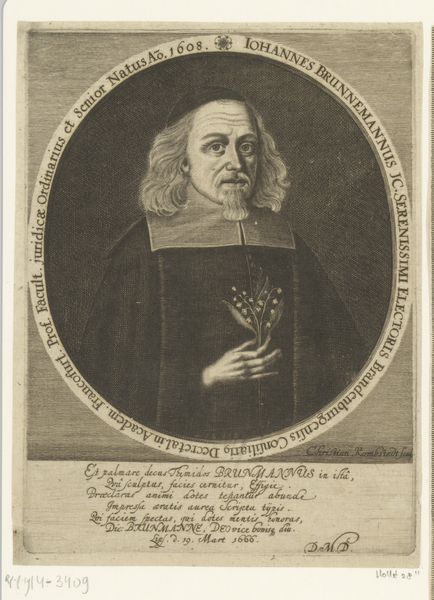Curator: Here we have Matthias van Sommer's "Portret van Paul Maemminger," an engraving dating back to 1664. Editor: The density of line work is astonishing! It gives the portrait such a solemn and, dare I say, a serious, perhaps slightly ominous atmosphere. Curator: Precisely! Van Sommer uses the density of the engraving lines to model form and shadow, creating a palpable sense of weight and presence, imbuing the subject with an undeniable authority. Notice the textural contrast: the dense cross-hatching on his garments, as distinct from the lighter touch defining his face. Editor: The use of text within the frame is interesting. Are these epitaphs, adding to the somber mood? Curator: The inscription provides a context for understanding Memminger's standing. Phrases indicate his role as a senior consul, as a member of the senate from Regensburg which highlights the sitter’s authority and status. The text, along with the ornate frame, act to elevate the figure of Memminger and suggest the importance that he holds. It elevates this particular print from a simple depiction to one of commemoration, and civic pronouncement. Editor: And that heraldic crest displayed at the left—what can we interpret from its design and placement? It functions almost like a signature, reinforcing not just his identity, but also that of the institutions he served. It speaks volumes about the visual language of power and prestige in that era. Curator: Indeed! The crest and all other signifiers in this piece serve as a testament to Memminger's significant public life. Editor: Reflecting on this piece, I'm struck by how such careful formal control truly allows for such striking historical resonance. Curator: Yes, it makes you realize how the artwork uses this historical and symbolic function to enhance its visual appeal and convey meaningful content.