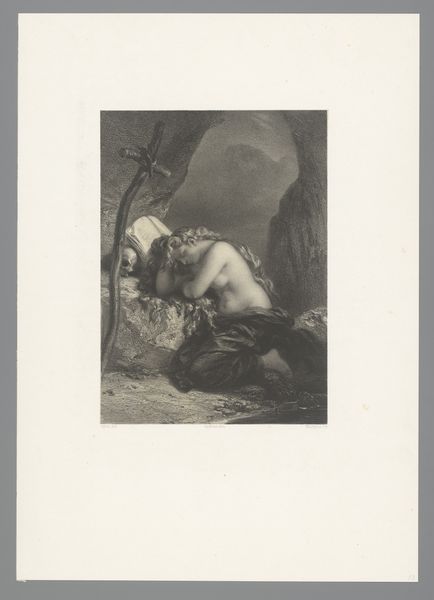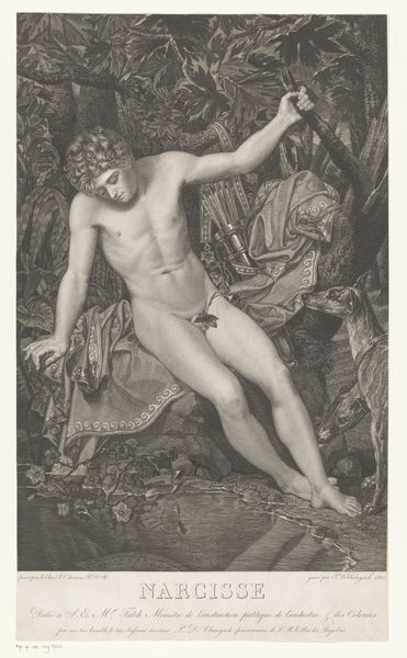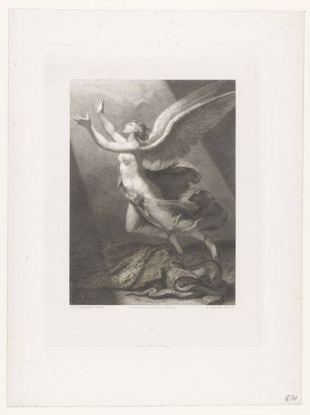Curator: Alexandre Vincent Sixdeniers's "Zephyrus," from 1829, presents an intriguing figure. The Romantic style is clear, and the medium, engraving, feels significant. It evokes a dreamlike quality. What stands out to you? Editor: It's interesting how a seemingly straightforward allegorical nude can also bring out questions of the materials involved. Engraving seems like a time-consuming process. How does the materiality of the printmaking process shape the image we see here? Curator: The very act of engraving, meticulously carving lines into a metal plate, inherently dictates a level of control and labor. Consider the social context: engravings were a means of distributing imagery, making art accessible to a wider audience beyond the elite who could afford original paintings. Does that influence your view? Editor: It does make me consider accessibility and value. This piece feels inherently tied to the concept of reproduction, moving it away from being this unique "high art" object. The lines, made with intention but ultimately reproducible, challenge this. Was Sixdeniers consciously grappling with these ideas? Curator: It's a crucial question to ask! While we can't know Sixdeniers's explicit intentions, a materialist reading invites us to consider the economic and social functions of art. The choice of engraving facilitates wider circulation, transforming the artwork into a commodity. Do you notice the absence of color? Does it point to an interesting interpretation of social class? Editor: I see your point. Perhaps the black and white image served to depersonalize the art itself. So, examining the engraving as a manufactured object adds a critical dimension, taking it beyond pure artistic expression and getting closer to socio-economics of art. Curator: Precisely! By focusing on the materials and the means of production, we can start to uncover the complex relationships between art, labor, and consumption. Hopefully, the listeners also gleaned some understanding on this analysis as well! Editor: That’s a helpful perspective! I now understand the work in terms of process rather than simply aesthetic. Thank you!