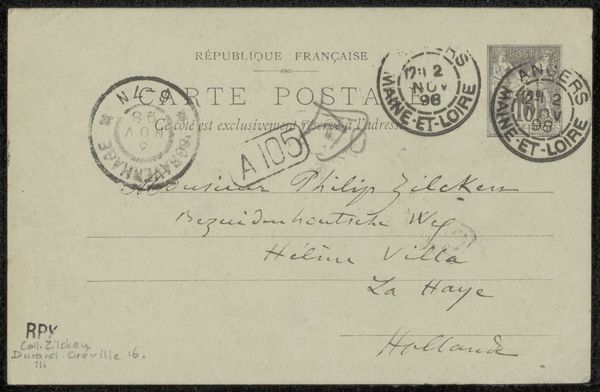 Editor: Here we have "Briefkaart aan Philip Zilcken," potentially from 1889, housed at the Rijksmuseum. It seems to be a postcard, maybe a pen drawing or print of some sort with hand-lettering. There's a certain intimacy to it, almost like we’re peering into a private conversation. What aspects stand out to you? Curator: The immediate thing that strikes me is its function within the social history of art. It’s not just a drawing; it's a piece of postal communication, a brief message sent between artists or members of the art world. Consider the democratization of art made possible by postcards. Before widespread photography and printing, how did artists connect and disseminate their ideas? Editor: So, the postcard itself is almost as important as the message? Curator: Exactly! It provided a cheap, accessible medium for sharing images and thoughts. We must consider its socio-political context: late 19th-century Europe, experiencing rapid industrialization and the rise of mass media. This postcard facilitated the growth of artistic communities and allowed for broader participation in art culture. The postmarks are integral. Paris and Brussels highlight movement, exchange. How do the stamps, the postal markings, act as traces of its journey? What can we interpret about art world networks via this? Editor: That’s fascinating, viewing the postcard as an artifact of communication. I hadn't considered how essential that might be! Curator: Yes, the medium is the message. And reflecting on it, it adds layers of meaning. Looking at art in this way gives new appreciation, for instance, on a social scale, versus looking for something to fit art historical movements in fine arts. Editor: I’ll definitely look at art differently going forward!