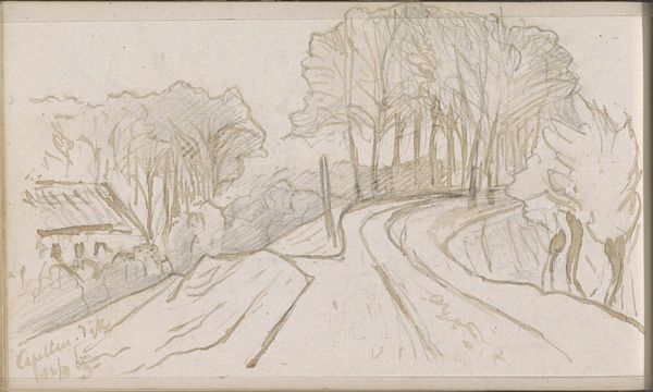 Editor: So, here we have "Landweg bij Sneppenschrik," a landscape drawing from the 1860s by Johannes Tavenraat, rendered in ink and pencil. It feels…almost unfinished, dreamlike in its hazy details. What catches your eye when you look at this piece? Curator: The road, undeniably. Roads in art, historically, serve as potent symbols. They can represent life’s journey, choices, the path to enlightenment, or even the unknown. The winding nature of this particular road evokes a sense of exploration, but also perhaps uncertainty. Notice how the trees on either side seem to press in, creating a sense of enclosure. Does that suggest anything to you? Editor: Maybe a feeling of being guided, or even a bit confined, rather than freely exploring? Curator: Precisely. And the use of ink wash, creating those muted tones, contributes to a contemplative mood. In Dutch art, landscapes weren’t just pretty pictures; they often reflected national identity, a sense of place. How do you think that might apply here? What feeling about “place” does the work suggest? Editor: It doesn't feel grand or imposing like some landscapes. It's quite intimate, almost like a private moment in nature. Maybe that reflects a more personal, less nationalistic, view of the land? Curator: An interesting point. And consider the medium – drawing. It suggests immediacy, a fleeting observation. Tavenraat may have captured not just a physical location but a feeling, an emotional response to the landscape. So, what emotional weight is being suggested, in your estimation? Editor: I hadn't thought of it that way. The dreaminess lends a melancholic note, as if this ordinary landscape is deeply precious precisely because it is ephemeral. I guess what I will take away is to look beyond the simple depictions in a landscape and see what it says about the artist's feelings. Curator: Indeed. By deciphering these visual symbols, we gain access not only to the artist’s intention but also to the cultural values embedded within the artwork and, in a way, within ourselves.