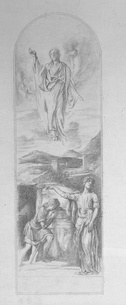Curator: This is Johann Friedrich Overbeck’s "Romantic Scene," held here at the Harvard Art Museums. Editor: It’s arresting, isn't it? The figures look rather forlorn against that stark background. Curator: Note the linear precision Overbeck employs. The deliberate composition guides your eye, focusing on the interplay between the figures and the subtle gradations of light. Editor: It evokes a sense of melancholy, doesn't it? I wonder what narratives of unrequited love and idealized beauty were circulating in Overbeck's social sphere? Curator: Indeed. The visual language here transcends mere representation; it's a profound meditation on form, balance, and the very essence of visual harmony. Editor: I find myself drawn to the way he uses imagery to explore those tensions. It speaks to the complex interplay of romantic longing and societal constraint. Curator: A fitting end to a compelling visual inquiry. Editor: Indeed. It leaves one with much to ponder.