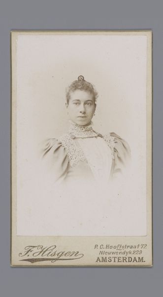 This photographic portrait of an unknown woman was made by Machiel Hendricus Laddé in Amsterdam. The sitter's direct gaze is softened by the ornate, high-necked dress which acts as a frame for her face. Notice the brooch at her throat, a subtle yet potent symbol of status and personal identity. Brooches, like amulets in ancient times, have long carried layers of meaning, serving not just as adornment but as emblems of belonging or protection. One might recall similar adornments in Renaissance portraiture, where jewels and finery signaled wealth and social standing. Yet, here, the brooch's modest size suggests a more personal narrative, perhaps hinting at inherited memories or a quiet assertion of self. These recurring motifs in portraiture, the gaze, the adornment, are echoes across time. They remind us that images, like memories, are never truly new but rather palimpsests layered with cultural and psychological resonance.