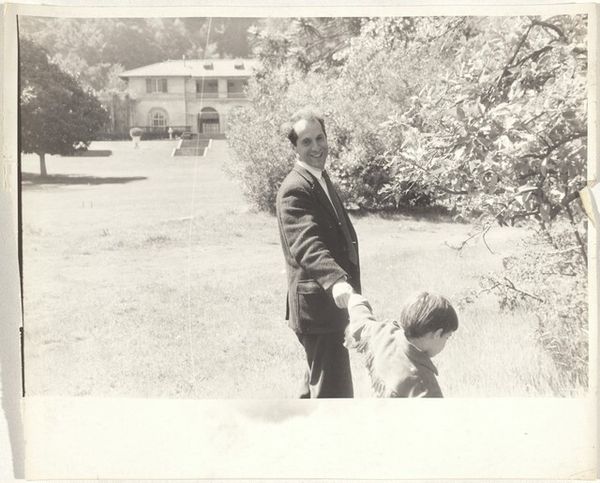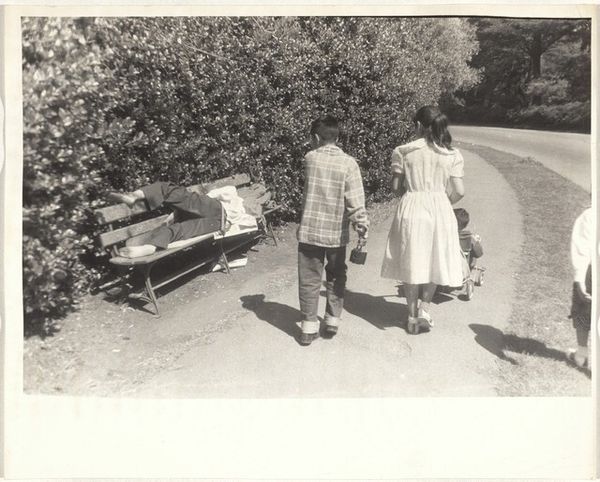 Editor: So, here we have Robert Frank's "Mary, Pablo, Andrea, and boy in parking lot--Los Angeles," a 1955 print. It strikes me as a bit melancholy. A woman is leading three children away from us across a parking lot. What feelings or ideas does this image spark for you? Curator: It whispers stories, doesn't it? It pulls me back to that post-war era, where American optimism was wrestling with a creeping sense of unease. Frank, bless his restless soul, captured that tension beautifully. Notice the light—so stark, almost unforgiving. What does that harshness suggest to you? Is it highlighting vulnerability, or maybe resilience? Editor: I guess I see the vulnerability more, especially in how small the children seem in all that space. And their backs are turned, so you can’t read their expressions. It's isolating. Curator: Precisely! Frank had this incredible knack for finding poetry in the mundane, right? He wasn't afraid to show the quiet sadness hiding behind the chrome and tailfins of 1950s America. Those vintage cars become like watchful sentinels in this suburban nowhere. What do you suppose the arrow in the parking lot suggests? Editor: Maybe a direction? Like they’re moving on to something new, or away from something old. Curator: Or, playfully, perhaps that even a direction towards new possibilities doesn't dispel uncertainty. Frank wasn’t one for simple answers, thank goodness! It's an unposed and almost clumsy shot and its lack of clear focus is what makes it feel more alive. Like a snatched moment. Editor: I didn’t really get that before, but now I appreciate the raw, almost snapshot-like quality more. It feels less staged, more…real. Curator: Exactly! Real life is rarely posed and perfectly polished, eh? Thanks for helping me look at it in a fresh way. Editor: And thank you for putting words to what I felt but couldn't quite express. I feel like I get Frank and his photography a lot better now.