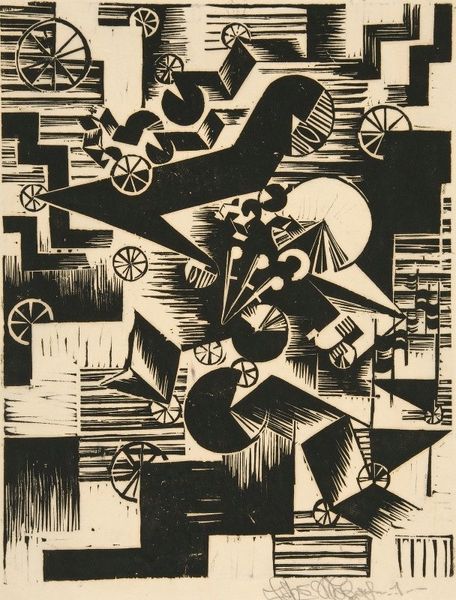 Curator: So, we’re looking at Milan Erazim’s "Chance No. 1" from 1992, a print using mixed media, including watercolour and possibly even some spray can art on toned paper. First impressions? Editor: Well, it feels claustrophobic, almost menacing. The angular lines, the disfigured figures... it’s like peering into a nightmare happening in a run-down office building. Curator: Yeah, I can feel that. There's an unsettling energy here. You know, Erazim’s work often delves into themes of alienation and social decay within post-communist Czech Republic. It’s interesting to see how he’s layering textures and techniques, contrasting the precision of printmaking with the fluidity of watercolour, and I imagine some kind of stencil work in the back, like the ones used in street art. Editor: The figures feel trapped, contorted by the architecture around them. The tile grid, the harsh lighting...it’s as if the space itself is an oppressive force. It’s quite a critical view on structures. Curator: Exactly! The grid suggests order, but it's a broken order, you know? Those vibrant pinks and blues cutting through the darkness, do they bring any emotion for you? Editor: Yes, there is hope. Perhaps resilience, a kind of desperate, flickering humanity pushing back against the dehumanizing forces at play. And how the body almost melts within it; it’s both alluring and repulsive. Curator: Yes, maybe that burst of color offers a glint of, well, "chance," in this bleak landscape, fulfilling the artwork's title, but who knows, that may be reading it with naive eyes. It definitely moves away from idyllic watercolors. Editor: Erazim pushes us to confront the uncomfortable realities of transition and transformation, the costs and the hopes. "Chance No.1" isn't just a title, it is a proposition to what could exist on the other side. Curator: Mmh. I always found a unique ability to reveal, with a delicate approach, harsh circumstances we would have otherwise overlook. Editor: True, a difficult artwork for challenging times that can trigger difficult but crucial dialogues, even nowadays. Curator: Indeed. Food for thought.