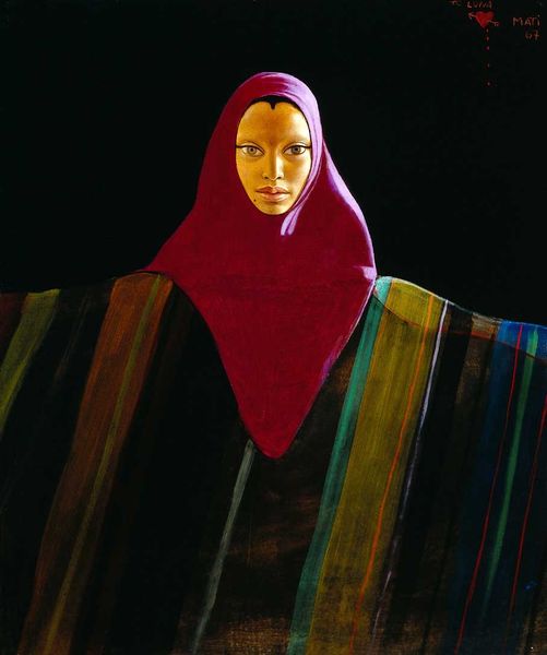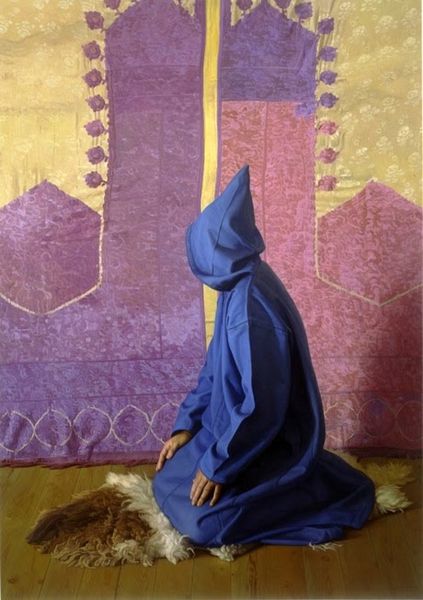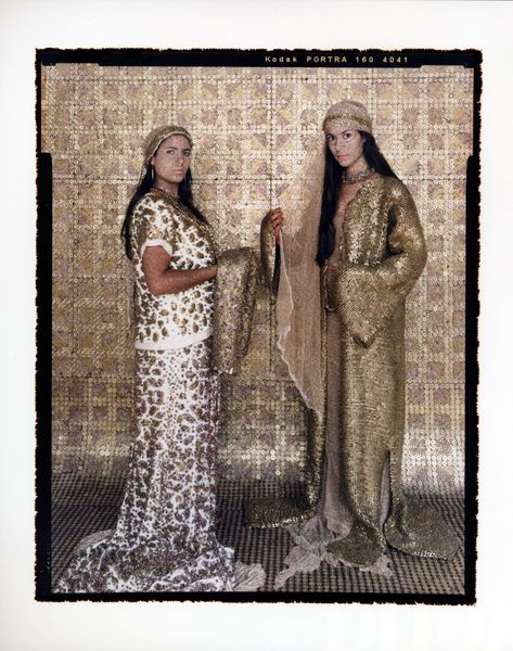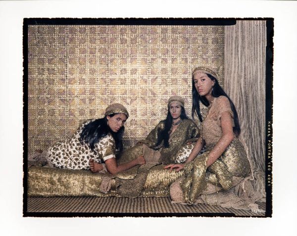 Editor: This is Lalla Essaydi’s "Converging Territories #30" from 2004, a mixed-media piece using photography and textile elements. The subjects appear almost camouflaged, blending into the backdrop with clothing that mirrors the wall's pattern. It feels both intimate and strangely distant. How do you interpret this work? Curator: Essaydi often uses her art to challenge Western perceptions of Islamic women and the spaces they inhabit. The act of veiling, frequently viewed through a colonial lens as oppressive, is recontextualized here. Consider the women’s clothing and the backdrop, covered in what appears to be henna writing – traditionally a form of female adornment, also used to record history or keep secrets. Editor: So, it's not just about concealment, but perhaps a declaration or redefinition of identity? Curator: Exactly. Essaydi is working within and against the orientalist tradition. These women aren't simply passive figures. They are actively participating in the construction of their own image. Are they imprisoned, or are they the ones guarding the boundaries? How do you see the women in relation to the patterns that surround them? Editor: I see how they kind of push back against the stereotypes and play with the concept of hiding and revealing simultaneously. They seem empowered despite being veiled. Curator: Precisely. And Essaydi, through the convergence of photography, painting, and calligraphy, pushes us to question the assumed boundaries between tradition and modernity, private and public, oppression, and agency. Editor: It’s a lot more complex than I initially thought! This has completely changed how I understand the image. Curator: Art allows for these re-readings. Essaydi invites us to interrogate our own assumptions and engage with a richer, more nuanced understanding of identity.