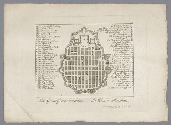 Curator: Oh, look at this architectural marvel. It is the "Plattegrond van Villa Farnese te Caprarola," created after 1655 by Giovanni Battista Falda. It's a print, showcasing a floor plan of the Villa. What do you make of it? Editor: Intriguing! At first glance, it resembles a bizarre geometric starfish. There is something cold and forbidding, yet exquisitely planned about it. Curator: Exactly! Falda captures the villa’s pentagonal shape with incredible precision. Each point houses a bastion, demonstrating power and control beyond just living space. He really understood how architecture reflects social status. It's a bold statement, right? Editor: Absolutely. You can see that intent baked into its very structure. These rigid angles are softened internally, and what about that amazing central rotunda. Is it supposed to feel grand? Overpowering? Curator: It’s both! The rotunda was intended as the heart, both practically and symbolically connecting all the villa's wings. Falda meticulously depicts it, almost a celebration of the architectural design. Editor: Yes, there is artistry. But think about that imposing design. In effect, it is using beauty as another tool of asserting control, of presenting a singular, almost inescapable vision of order. It gives one pause to imagine what the intention would be from that era of political maneuverings, class division and displays of power. Curator: A good point! What about its setting amongst Italian gardens during the height of the Baroque period. Don’t you think there might be also playfulness to that visual dynamic? I mean, consider this detailed sketch on aged paper… Editor: I still read a touch of austere pride in the building, that it is asserting its authority with every precise line of ink. But thinking of those manicured gardens with playful fountains against such disciplined structure... there's the paradox of the era! A kind of cultivated chaos. Curator: An apt description. The beauty of architectural drawings lies not just in their aesthetic appeal, but their stories! Thanks for walking through it with me. Editor: Indeed. They teach us so much more about what the artists wanted to represent during these historic periods. Fascinating to ponder what intentions and choices helped form our current context!