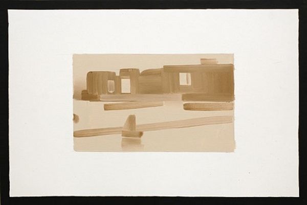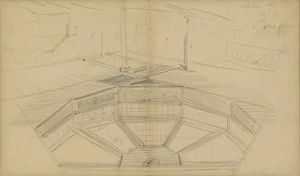 Editor: This is "War Room" by Amze James Emmons, a drawing with sparse red lines on a pale sheet, currently held at the Harvard Art Museums. It feels unsettling, almost like a stage set. What do you make of it? Curator: It's interesting how Emmons uses the stark perspective to evoke power and surveillance. The 'war room' concept, historically loaded, is stripped bare. What socio-political narratives do you think this evokes in our current climate? Editor: I guess it speaks to the transparency, or lack thereof, in decision-making. It feels sterile. Curator: Precisely. Perhaps Emmons critiques the very architecture and institutional spaces where such decisions are made. It's a powerful statement. Editor: I hadn’t considered the institutional critique element so explicitly. Thanks!