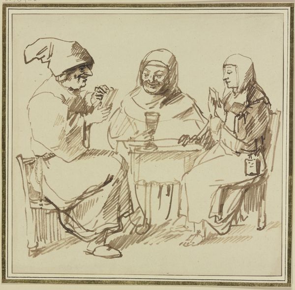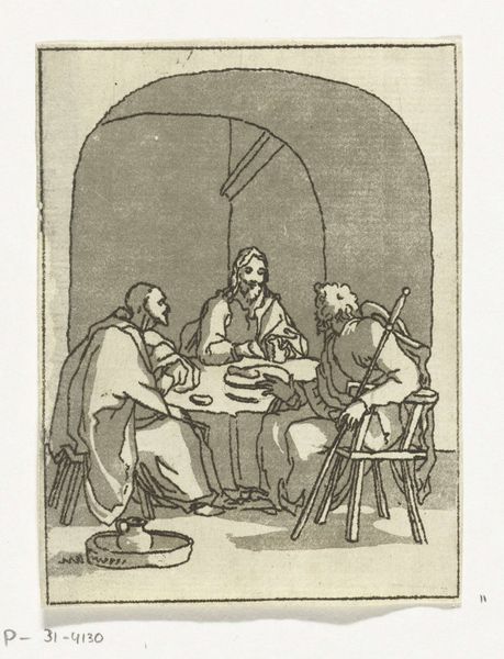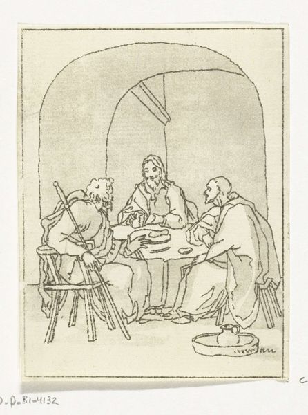 Anthonie van den Bos created this line drawing titled "Maaltijd te Emmaüs" sometime between the late 18th and early 19th centuries. Van den Bos lived during a period of great social upheaval, witnessing both the Enlightenment's emphasis on reason and the tumultuous years of revolution and societal restructuring. The artwork depicts a scene from the Gospel of Luke, yet the simplified lines and stark composition prompt us to consider the social dimensions inherent in religious narratives. How might the act of sharing a meal—a deeply human and communal experience—transcend its spiritual connotations? Could the humility and fellowship demonstrated in this scene inspire reflection on equality, particularly when considering the entrenched class structures and economic disparities of van den Bos’s era? The artwork’s minimalism invites viewers to meditate on the symbolic weight of shared resources. As we observe the figures gathered around the table, let us consider the emotional resonance of breaking bread together, and perhaps even draw parallels with contemporary struggles for justice.