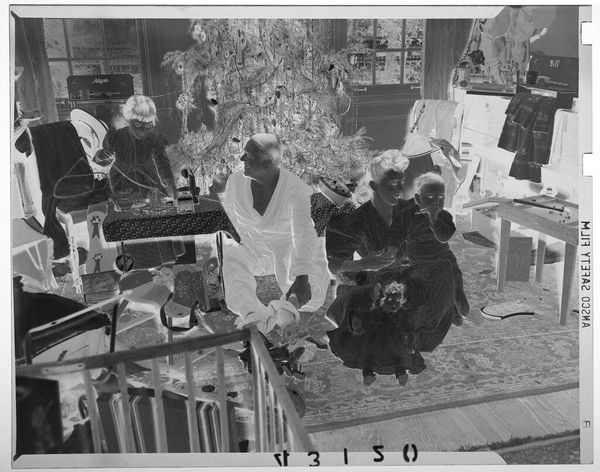 Curator: Martin Schweig's untitled photograph presents a nun and a young woman at the entrance of a school store called Gypsy Caravan. Editor: The contrasting figures immediately strike me—the stark habit against the shop's somewhat chaotic, bohemian atmosphere creates a visual tension that's quite captivating. Curator: Considering the title, or lack thereof, and the suggestive store name, Schweig seems interested in juxtaposing religious and perhaps counter-cultural elements within the educational setting. Editor: The way the light falls, almost flattening the subjects, contributes to a kind of detached observation, turning the figures into symbolic forms more than individuals. I wonder what the symbolic weight of the goods are? Curator: Indeed. It's a study in contrasts, achieved through framing, setting, and perhaps a subtle commentary on institutional norms. Editor: Ultimately, this small photograph raises bigger questions about the roles we play and the spaces we inhabit.
