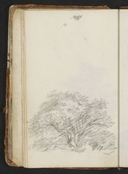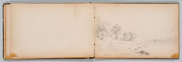Editor: This is Sanford Robinson Gifford's "Landscape with Trees and Figures" from the Harvard Art Museums. The delicate graphite strokes create a somewhat obscured vision. What do you make of the contrast between the clear branch and the more chaotic landscape? Curator: The interplay between the precise botanical study and the amorphous landscape invites examination. Observe how Gifford employs line and mass to suggest depth. Is it a study in contrasts, or an exploration of varied modes of representation? Editor: It's almost as if two different artists worked on opposing pages. I never really considered representation in that way. Curator: Indeed. It offers a nuanced view of Gifford's formal exploration of space. Editor: I see it now. Thank you for pointing out the variation in form.