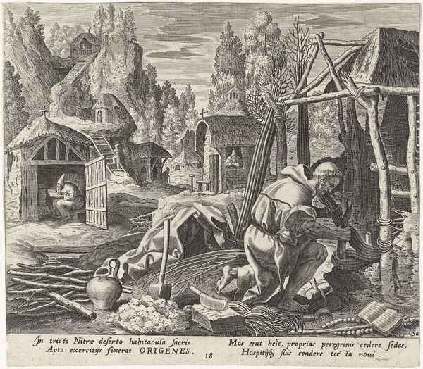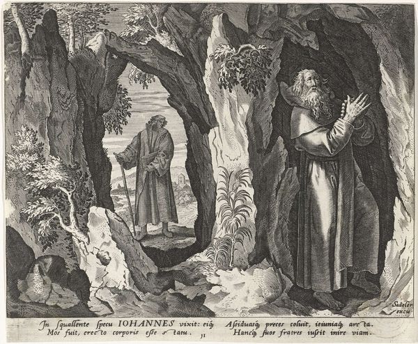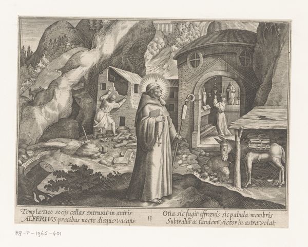 Editor: This engraving from 1598, “Heilige Alpherius als kluizenaar” by Johann Sadeler I, shows a mountainous landscape with what looks like monks at work and prayer. It's so detailed, but has this fantastical, almost dreamlike quality. What stands out to you most about it? Curator: What strikes me is how this print participates in a larger discourse of monastic reform during the late 16th century. We see Alpherius, framed both by established architecture and the raw, untamed wilderness. The implication is that Alpherius shapes and orders the landscape, bringing civilization to the wild. Note the Latin text at the bottom—it speaks to how Alpherius builds both physical structures *and* societal structures in service of God. Editor: So, you're saying it's not just about the saint himself, but about the power structures he represents? How monasteries at the time helped to solidify the control of the Church? Curator: Exactly. Mannerism, which we see stylistically, thrived under very specific types of patronage that gave rise to sophisticated, and at times overwrought and dramatic compositions that speak of power. How does the landscape contribute to the feeling of this image? Is nature a help or a hindrance to Alpherius’ holy life? Editor: Well, the landscape feels almost imposing. The mountains dwarf the figures. Perhaps it emphasizes the challenges and hardships Alpherius and his monks endured, highlighting their devotion. Curator: That contrast you identified between the natural and built environment underlines the church's ambitions to assert authority over the physical world, mirroring their spiritual authority. Did anything about this artwork shift how you now look at similar works from this era? Editor: Absolutely. I didn’t realize how political these idyllic religious scenes could be. It gives the composition another layer of depth, making it richer.