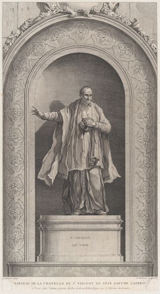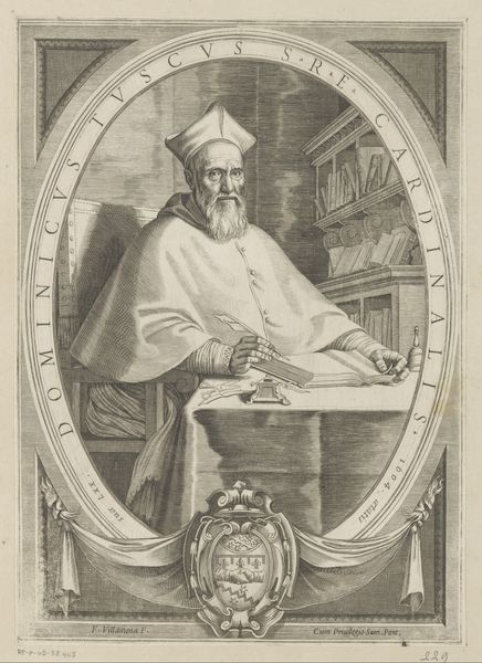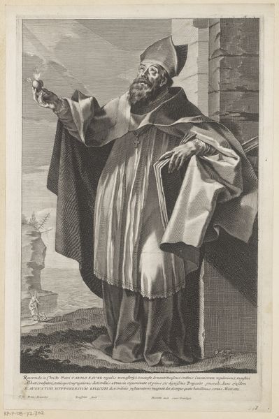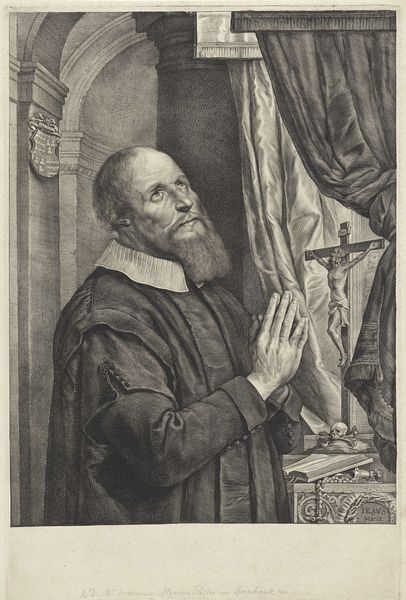 Editor: Here we have an engraving dating back to sometime between 1627 and 1640, "St. Francis de Paul," by an anonymous artist, held at the Metropolitan Museum of Art. The image depicts the saint in what looks to me like deep prayer. What really strikes me is the presence of both the crucifix and the skull, side-by-side. What do you make of it? Curator: Indeed, the juxtaposition is potent, isn't it? Consider that these aren't merely objects but powerful symbols. The crucifix, radiating light, embodies sacrifice, redemption, and eternal life – deeply embedded within Christian cultural memory. And beside it, the skull... what stories does that tell? Editor: Well, skulls are pretty commonly understood as memento mori, reminders of mortality. Curator: Exactly. It’s a symbol deeply rooted in our understanding of life’s impermanence. Placed next to the radiant crucifix, it encourages contemplation. Saint Francis isn't simply praying; he is actively mediating on his own mortality in light of his faith, seeking spiritual strength and perhaps reflecting on the suffering and resurrection of Christ. What feelings does the inscription, especially "tabescet in me anima mea," evoke in you? Editor: That phrase… "my soul languishes within me…" suggests a real internal struggle, maybe a feeling of being worn down by life. It adds a layer of vulnerability. I see the piece now as not just about piety but also about a very human battle. Curator: Precisely! Mellan, even while depicting religious figures, taps into universal emotions: hope, fear, and the longing for meaning in the face of death. Editor: It's amazing how symbols, like these, create dialogues across time. Curator: Absolutely. These visual languages transcend eras, allowing us to connect with the anxieties and aspirations of those who came before. Each piece reminds us that humans, in their core, remain consistently searching.
