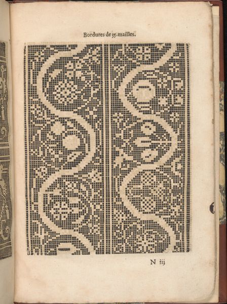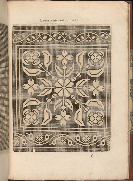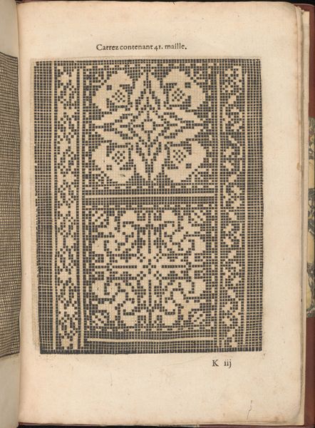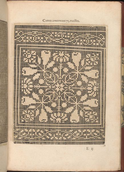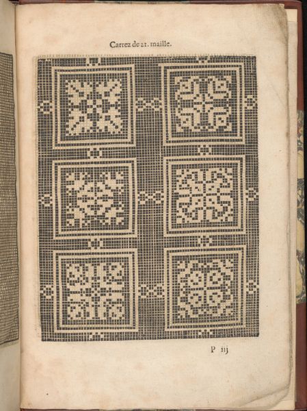 Curator: Today, we’re observing a page from "Les Secondes Oeuvres, et Subtiles Inventions De Lingerie du Seigneur Federic de Vinciolo Venitien," created by Federico de Vinciolo in 1603. It's an engraving on paper. What are your initial thoughts? Editor: My immediate reaction is a kind of rigid order, it almost looks like an early computer punchcard. The repetition of these geometric motifs creates a very deliberate and almost austere aesthetic. Curator: Absolutely. Vinciolo was offering patterns for lacemaking and embroidery. This particular plate showcases designs using squares, internally patterned and arranged methodically within larger borders. Look at how the squares form the basis of these more complex repeating figures. Editor: Which speaks volumes about the expectations placed on women's labor during the Renaissance. This wasn't simply about aesthetics; it was about adhering to precise patterns, conforming to societal expectations of skill and domesticity, using tools considered acceptable, indeed feminine. How much control did a woman actually have over her own creative expression, trapped within these pre-designed, meticulous grids? Curator: I think your reading overstates the case somewhat. The framework Vinciolo provides allows for variation and adaptation by the embroiderer, even while adhering to the geometric structure. We must appreciate the visual harmony created by the contrast of filled and empty space within these square modules and the symmetry exhibited across the page, which creates rhythm and an attractive, formal coherence. Editor: But isn't the perceived "harmony" really just a reflection of Renaissance ideals of order and hierarchy? To celebrate only the pattern, not question its constraints, is to participate in an ongoing project that silences the historical experiences of marginalized craft workers. We should be questioning the narrative of perfection these works embody. Curator: I would counter that we can acknowledge those constraints while still examining the success of this work as a pattern book page. It provides a structural clarity that I appreciate. Its geometrical approach provides order. Editor: Perhaps our disagreement illustrates precisely what makes this print so compelling: its ability to generate varied readings across centuries. I, for one, can’t look past the history of craftwork that it evokes.