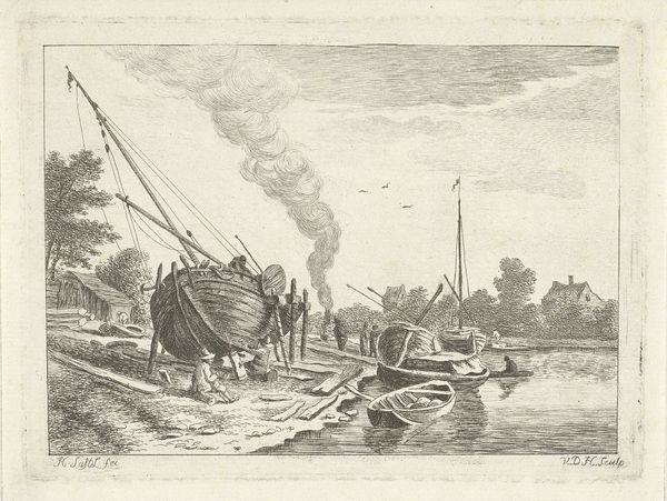 Editor: So, here we have "Scheepswerf aan een rivier," or "Shipyard on a River," an etching by Anthonij van der Haer, created sometime between 1745 and 1785. The detailed lines and composition give it a very industrious feel. What jumps out to you when you look at this piece? Curator: I'm struck by the rigorous deployment of line. Notice how van der Haer uses the varying weights and densities of the etched lines to construct spatial depth. The foreground, with its meticulously rendered boats and figures, has a higher concentration of lines, creating a sense of immediacy and tactile presence. The background, with the river and distant buildings, features lighter, sparser lines, which effectively recede into the distance. Editor: That's interesting! I was so focused on the narrative, I hadn’t considered the line work so explicitly. Does the composition have something to tell us? Curator: Certainly. Consider how the central motif, the large ship under construction, is carefully positioned to command attention. The verticality of the ship's mast is cleverly balanced by the horizontal sweep of the shoreline and the smaller vessels. This interplay of vertical and horizontal elements creates a stable yet dynamic composition, lending a sense of ordered activity. Do you notice how the cluster of figures is arranged around the ship? Editor: Yes, it almost feels like a circular flow, guiding the eye around the central subject. It definitely emphasizes the activity around the ship. Curator: Precisely. It reinforces the notion of human agency and constructive endeavor, framing the industrial scene in an aesthetic manner. Editor: This has totally changed how I view the piece. It's much more than just a pretty picture; it's a sophisticated exercise in composition and line. Curator: Indeed, the etching serves as a testament to van der Haer's mastery of his medium and his ability to translate the gritty realities of shipbuilding into an engaging visual experience.