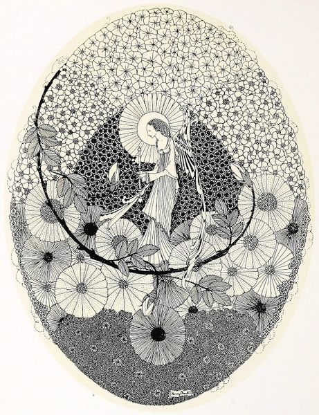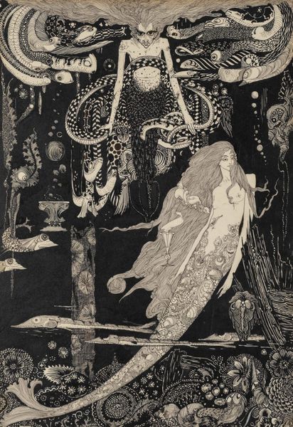 Curator: This intricate drawing, executed in ink, is one of Harry Clarke’s illustrations for the 1923 edition of Edgar Allan Poe’s *Tales of Mystery and Imagination*. Editor: What strikes me immediately is its overwhelming sense of unease. It's densely packed, almost claustrophobic, yet somehow ethereal. Is that intentional? Curator: Clarke was a master of visualising the psychological landscapes Poe created. The swirling lines, the profusion of detail—they mirror the stories' themes of decay, obsession, and the blurred lines between reality and nightmare. Look at the haunted faces emerging from the flora, all these Ophelia figures and the melancholy figures towering above... Editor: I see how those figures above look at once paternal and menacing, almost like a puppet master controlling these ethereal forms. It's quite powerful, this visual representation of psychological turmoil—though I wonder how such an overtly stylized design was received in the '20s. Curator: Consider the context. The horrors of World War I had just ended, shattering old certainties. There was a fascination, both in literature and art, with the subconscious, with exploring darker emotions, Freud and his colleagues work. Symbolism which we can see here, really flourished under that social context, its influence and power grew and Clarke helped create this through commercial artworks such as this one. Editor: A perfect illustration for the anxieties of a generation struggling to make sense of a world turned upside down. There's a tension between the beauty of the craft, the sheer skill in rendering this complex image, and the disturbing subject matter, it speaks volumes. Curator: Indeed. It's a potent reminder that beauty and horror can coexist, and that sometimes, the most unsettling art is the most enduring. Editor: Absolutely, an image that speaks to us even now through potent iconography and skilled, meticulous draftsmanship.