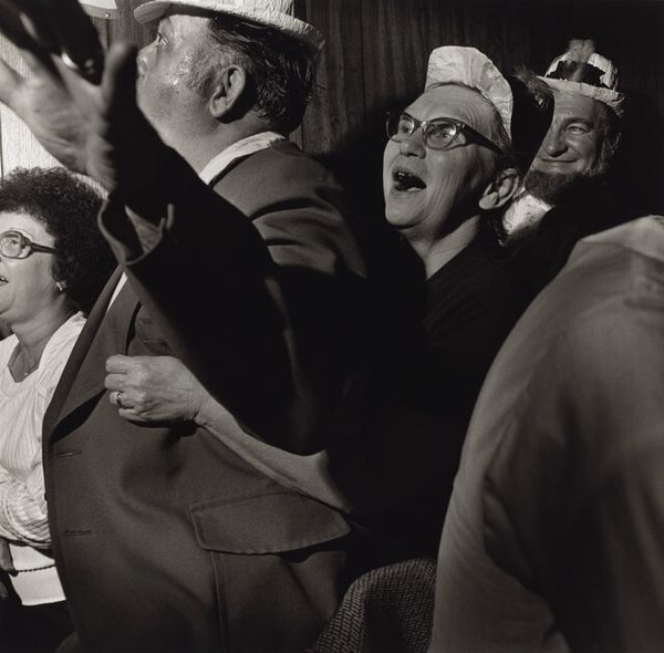Robert Frank made this photograph in Caerau, Wales. It's all about capturing a moment, a fleeting expression, which, in this case, is laughter. The tones are muted, almost sepia, lending it a timeless feel. Look at the faces in the foreground. The graininess adds to the sense of immediacy, like a quick sketch rather than a polished portrait. The focus isn't perfect; it’s more about feeling than seeing. The laughter seems to ripple through the composition, from the foreground figures to the performers on the small stage in the background. The light flickers and dances. This makes me think of Daumier, who would always capture the everyday with a gentle irony. I think Frank is doing something similar here, capturing a shared experience. It is about the ephemeral nature of performance, the momentary connections we make with each other, and, finally, the fleeting nature of life itself. It's a photo that invites you to listen as much as to look.