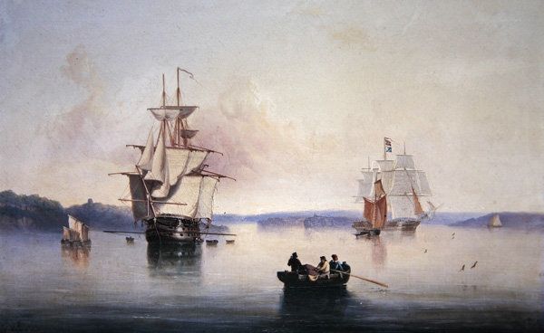 John Wilson Carmichael painted this scene of the Shipyard at Hessle Cliff in oils during his career as a maritime painter. The image offers a glimpse into Britain's shipbuilding industry, likely during the early to mid-19th century. The scene hums with activity, showing a hive of workers constructing the wooden vessels that powered Britain's naval and commercial ambitions. The figures in the foreground are separate from this industry. This boat could symbolize a different class, one that doesn't have the same access to the economic growth that Britain was experiencing, instead having to exist on the margins. The social conditions that shaped artistic production, particularly the rise of industrial capitalism and the social stratification it produced, are crucial to understanding this work. Archival research into the shipbuilding industry, labor practices, and the lives of workers in Hessle would provide valuable insights.