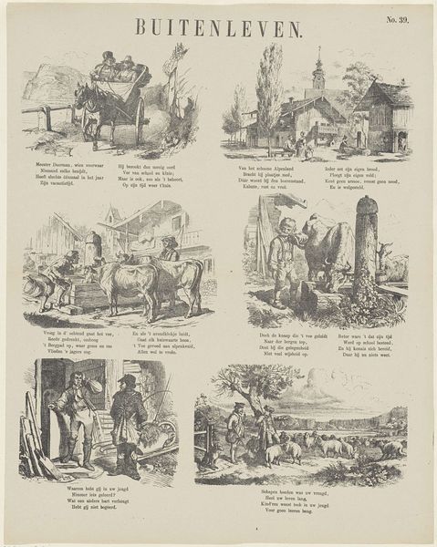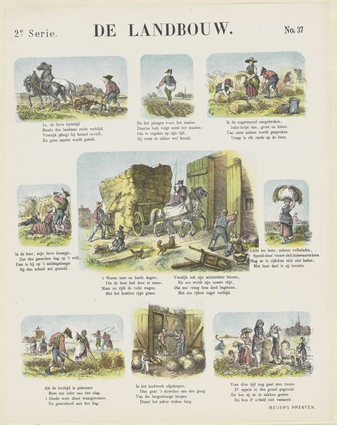 This print by De Ruyter & Meijer, presents several scenes organized in a grid-like structure across its surface. Each vignette is delineated with fine lines, creating a series of distinct visual units. The color palette is restrained, employing muted tones that lend a sense of historical distance. This compositional arrangement invites us to consider how the individual scenes relate to one another and the function of their placement. The grid, as a structuring principle, reflects a broader cultural impulse to categorize and systematize knowledge. Each scene operates as a sign, and when interpreted collectively, they create a network of meanings indicative of the period's values and social norms. The ordering of these signs invites us to decode their underlying structure. The seemingly simple arrangement pushes us to rethink how meaning is constructed through visual syntax and cultural context.