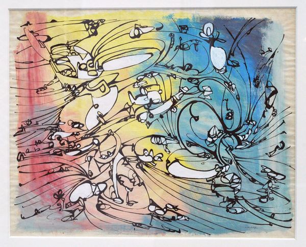 Editor: This is David Kakabadzé’s "Abstraction," painted in 1927 using watercolor. There's a really interesting combination of free-flowing forms against a stark, almost cosmic background. What can you tell me about it? Curator: This piece, for me, is all about disrupting expectations. Kakabadzé, working in the Soviet era, presents us with what looks like pure abstraction, seemingly devoid of political messaging. But is it? Consider the cultural climate: what does it mean to create something so seemingly detached when Socialist Realism was ascendant? Editor: So you're saying it might be a quiet form of resistance? Curator: Precisely! The free-flowing, almost biomorphic shapes set against that structured dark background…it hints at a rejection of imposed order. This interplay – this tension between the individual and the collective – is incredibly powerful. Think of feminist theory: is this perhaps a reclaiming of fluidity against rigid structures? How can you contextualize it within discussions of cultural control during the 1920s? Editor: That makes me see the background differently now. It isn’t just space; it’s almost like a form of oppression, making the lighter foreground even more striking. Curator: Exactly. What you initially perceive as simple aesthetics may actually carry a complex political and social charge, encouraging dialogues about agency and authority. Editor: I never would have looked at it that way without understanding the history behind it. Curator: That's why it’s important to remember: art rarely exists in a vacuum. Exploring these intersectional narratives encourages us to actively engage with the artwork.