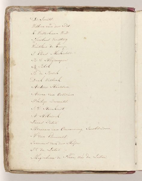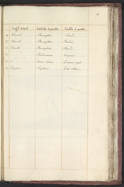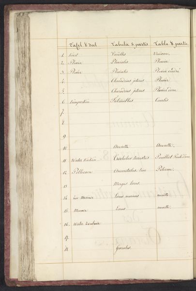 This page, "Lijst van dieren in derde deel van de viervoeters" was made by Joseph van Huerne, in the late 18th to early 19th century. It’s a list of animals, written in three columns, and three different languages; early Dutch, Latin, and French. The materials are simple: paper, ink, and thread. You can see the ruled lines, done by hand before the text was added. The handwriting tells us a lot about the pace of production. This was not a fast, industrial process but a careful transcription of information, intended to last. The book’s purpose was clearly to organize knowledge, recording and translating the names of beasts, great and small. Consider the labor involved in the bookmaking and transcription process. It speaks to a world where literacy and skill were valued, and where the careful accumulation of knowledge was a pursuit in itself. Far from being a mass-produced object, this book represents a personal investment of time and expertise. It stands as a testament to the enduring power of craft in the age of enlightenment.