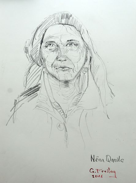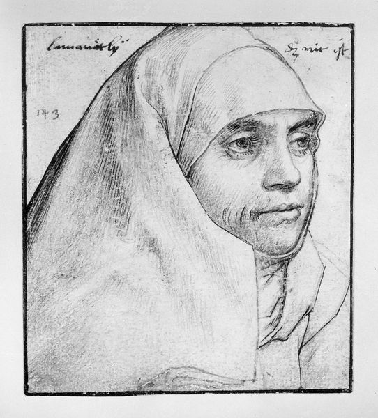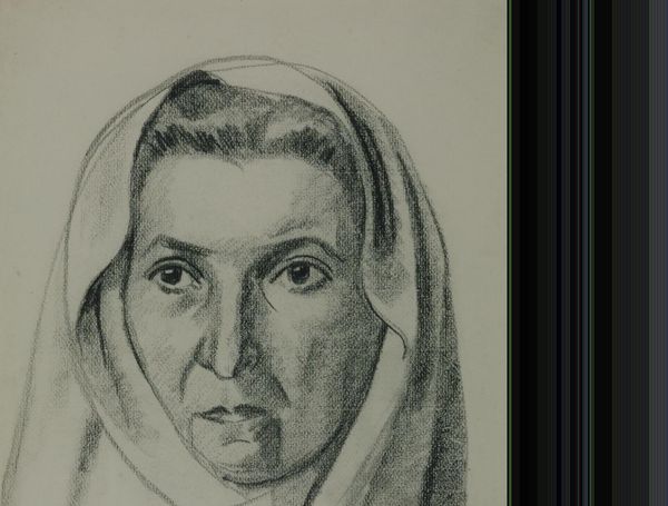 Editor: Kateryna Bilokur's "Self-Portrait" from 1955, rendered in pencil, is arresting. Her gaze is so direct and her expression…intense. What strikes me is how present she seems, despite being rendered in a relatively simple medium. What do you see in this piece? Curator: I see a woman deeply connected to her environment, almost rooted to the soil itself. Her headscarf is significant; it’s not merely a covering, but a marker of cultural identity, possibly hinting at her rural Ukrainian background and the values tied to it. Notice how the lines behind her head almost blend into foliage – suggesting a profound link between herself and nature. Does that connection feel deliberate to you? Editor: Absolutely. The way the background blurs makes her feel part of the land, which emphasizes her inner world. The hand touching her face…it reads almost like a gesture of contemplation, or even fatigue. Curator: Yes, the hand is a key element. It's a gesture we often associate with thought, but here, paired with those world-weary eyes, it carries the weight of experience. It also draws a direct line to centuries of portraiture conventions of thoughtful or intellectual individuals. Editor: So the artist is participating in an established visual vocabulary of intellectualism, while signaling ties to Ukrainian culture? Curator: Precisely. She's consciously placing herself within multiple layers of meaning. There is cultural pride interwoven with universally recognizable signs of knowledge and self-awareness. What does this tell us about how she perceived herself? Editor: That she wanted to be seen, understood. As more than just a woman, but as someone with history, thought, depth. It’s powerful to witness. Curator: Indeed, and by mastering those established symbols and using them in her own artistic language, she becomes part of art history.