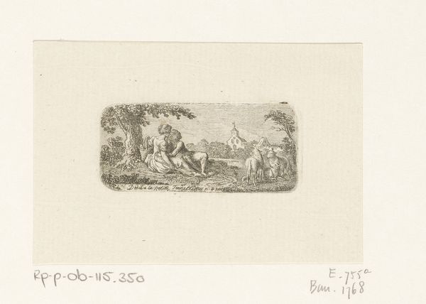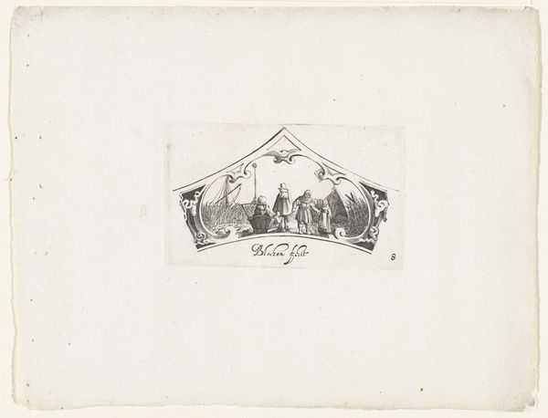 Editor: Here we have Daniel Chodowiecki’s “Pethion, Marat en het viswijf,” an etching from 1793. It’s quite small and the figures are delicately rendered. What first strikes me is the contrast between the standing figures in the foreground and the diminutive figures journeying along a road in the distance. What do you see in this piece? Curator: Initially, the framing oval draws the eye, isolating the narrative within. Note how Chodowiecki employs line weight: finer, more numerous lines coalesce to form darker tones, providing depth and contrast, whilst sparser lines denote areas of relative light, focusing the eye on Marat’s accuser. Editor: So, it’s less about what’s being depicted and more about *how* it’s being depicted? Curator: Precisely. Consider the arrangement of figures. Observe how they occupy the shallow pictorial space, creating a frieze-like effect. What feeling do you think that might evoke? Editor: A staged, almost artificial feeling, despite the seeming spontaneity of the interaction. Like a snapshot, yet carefully constructed. Curator: Good. Further, consider the surface texture achieved through the etching process. The varied line work creates a tactile quality. Ask yourself, what’s the importance of the relationship between technique and subject matter? How does that relationship change how you interpret the narrative within the artwork? Editor: It makes you question the "reality" of the scene, almost like it’s a fabrication or a commentary, rather than a direct record. That's fascinating; I’ll definitely be looking at prints differently from now on! Curator: Indeed, analyzing form allows us access into a more intricate understanding of the work's construction and, potentially, its intended impact.