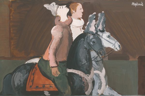 Curator: Here we have Cyprián Majerník’s "Equestrienne," an oil on canvas created in 1940. It depicts a woman on horseback, rendered in a somewhat muted palette. Editor: My first impression is of restraint, almost melancholy. The colors are subdued, the brushstrokes visible—there’s a rawness in the paint application. It's far from romanticized. Curator: Note the woman's attire—the white dress and head covering suggest ceremonial garments or traditional clothing. This visual motif hints at themes of purity, tradition, perhaps even a constrained femininity, given the time of its creation. Editor: Exactly, and the fact that it’s oil paint matters. Oil allowed for layering and reworking. What were the material limitations during wartime? Access to canvas, to pigments? It pushes the narrative away from grand statements and closer to the personal resources available to the artist. Curator: The horse, often a symbol of power and virility, seems strangely subdued as well, almost blending into the muddy landscape. One might also see in the horse's domesticated role the harnessing of natural forces, fitting with the control the woman may symbolize, even embodies. Editor: Interesting. I see it as an honest portrayal of rural life amidst war. The rough handling of the paint and the earthen colors speak to labor, to the day-to-day, rather than some elevated allegory. Consider who was commissioning or purchasing art at this time in that region. The market shifted—subject matter became bound by that new demand. Curator: The backdrop is a smear of greens and browns, almost indistinct. This ambiguity emphasizes the figures. And notice how the artist plays with light; it isn't naturalistic light but more of a mood-setting luminescence concentrated on the subjects. Editor: Right. And let’s remember that canvas was a resource; the size of this piece is crucial. This isn't meant for a grand salon; it's an intimate reflection created under constraint. The social context deeply affected material choice and application. Curator: I see that, I agree it’s more than simple portraiture. It is rich in symbol; even the way the woman is positioned on the horse could be read as a loaded cultural reference. Editor: Well, that tension between available means and what to represent makes the piece quite moving for me. It gives a palpable texture of experience. Curator: A convergence of the material world with layered cultural meaning. Editor: Indeed; a very sobering snapshot delivered to us through labor and limited means.