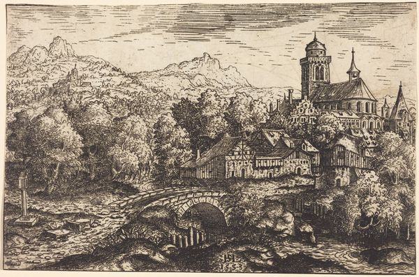 Curator: Let’s consider this etching by Karel Dujardin, titled 'Landscape with two horned goats in shadow at left foreground, village buildings beyond, from the series "The Small Landscapes,"' dating back to the mid-17th century. The way the goats are tucked into the lower left is very intriguing. What are your initial thoughts? Editor: It feels almost dreamlike, with the fuzzy lines of the etching blurring the distinction between foreground and background. The goats are such a contrast in darkness to the village and the sky, yet there is such little variation of line elsewhere. I am really interested in what others might find here. How do you interpret this work, considering it's an etching? Curator: We can delve into the means of production to better understand its context. Etchings were often more affordable and accessible than paintings, suggesting a broader audience and distribution of landscapes. The "small landscapes" denote their intimate consumption through handling of the prints, perhaps as unbound folios in one's collection. These were commodities meant to signal taste and sophistication through an association with bucolic imagery. How do the goats figure in this imagery and signal sophistication to the consumer? Editor: Well, placing the goats so visibly gives importance to farming and country life. At the same time, though, their obscurity almost contrasts the clean-looking village to invite reflection on their integration. Curator: Precisely. Dujardin has made strategic choices on how to focus the line in these figures, indicating labor at odds with nature. These etchings contributed to a market fascinated by idealizing the countryside. We begin to recognize the work less for its individual meaning but the material processes that were accessible in 17th century Netherlands, contributing to the demand for inexpensive replicable artworks. Editor: So, beyond the pleasant imagery, there's commentary on consumerism, class and how art was becoming more readily accessible in 17th-century Netherlands. I wouldn’t have immediately considered the social implications of its production. Curator: Exactly, by considering the etching process itself, its availability and distribution, and its accessibility for collecting and circulating as a commodity, we start seeing a richer commentary on society's values during Dujardin's time. This brings me to better see the contrast between the idyllic dream versus what capitalism actually entailed!