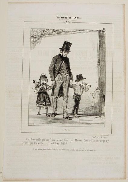 Editor: So, this is Honoré Daumier's "Robert Macaire, Merchant" from the 19th century. It feels like a snapshot of social class. What do you see in this print? Curator: The lithograph points to mass production. Daumier critiques the bourgeoisie through this easily distributed image. It questions art's exclusivity; copies democratize but also commodify social commentary. How does this tension change our interpretation? Editor: That’s fascinating. I hadn’t considered the printing process as part of the critique itself. Curator: Indeed, thinking about the process is crucial to understanding its meaning. This work truly shows how the means of production shape the message.