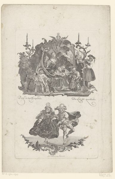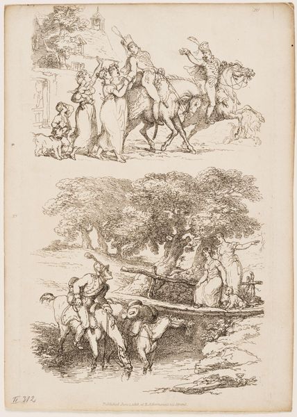 Editor: This is Thomas Rowlandson's "World in Miniature", a delicate line drawing. It's filled with different scenes, almost like a storyboard. How do you interpret the way Rowlandson presents these slices of life? Curator: This work speaks volumes about the social fabric of Rowlandson's time. Notice how each vignette seems to depict a different class, a different activity, a different power dynamic. It's almost as if he's presenting a microcosm of society. What do you make of that deliberate arrangement? Editor: I see how he contrasts leisure with labor, refinement with the mundane. Did Rowlandson intend to critique these social strata? Curator: Precisely! His satirical edge is evident. By juxtaposing these scenes, he invites us to consider the inequalities and contradictions inherent in the social order. How does this relate to contemporary issues of class and representation, do you think? Editor: It makes you think about who gets to define "normal" and whose stories get told. Thanks, I'm seeing so much more complexity now. Curator: Absolutely. Art like this encourages us to question those very power structures. It’s a small world, as Rowlandson suggests, but its inequalities loom large.