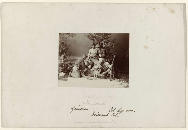 Curator: It’s an image of stillness, really. Even amidst what we know was a violent act. The photograph, titled "Shikhari (jachtgids), twee Engelsen waaronder vermoedelijk fotograaf sergeant Dalton, en jachtbuit in Tibet", was taken between 1903 and 1906. Editor: A hunt, then. What immediately strikes me is the composition—the arrangement of the three figures flanking the slain animal creates an unsettling symmetry. The positioning invites questions about power and domination over nature and native populations. Curator: D.T. Dalton, thought to be the photographer, captured more than just a hunting scene; this photograph implicates British colonial practices, a genre painting that freezes a moment of conquest, reflecting an epoch when adventurers turned photographers documented their dominion across foreign lands. Editor: Note the rifle placement – pointed downwards, almost mirroring the defeated pose of the animal. It adds a layered complexity, pointing beyond the simple documentation towards the latent violence underlying imperial enterprise. Curator: Quite right. And the framing itself, set within what appears to be a formal album page, elevates what might otherwise be seen as documentation of a hunting trip to an emblem of status and cultural narrative, one where the exotic becomes a token of authority. The image enters a genre painting mode precisely via such constructed artifice. Editor: Thinking structurally, that sharp tonal contrast between the crisp light hitting the figures and the shadowed space beneath the platform also creates an interesting sense of depth. This is a stage, and these are the players enacting their roles, forever paused in the lens’s regard. Curator: The work provides an unflinching portrayal of a historical moment imbued with complex meanings about control, identity, and the imperial gaze. A fascinating collision between social practice and self-fashioned grandiosity. Editor: Yes, there’s a stillness, and yet the tension of empire silently reverberates in this frozen instant. Something deeply disquieting persists.