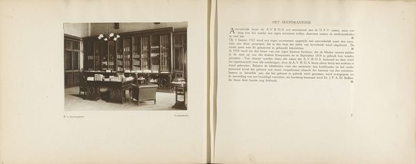 Curator: This photographic print, attributed to G. Koppmann & Co., presents the Volksheim in Hamburg. It offers a glimpse into a social settlement, featuring both its library and meeting room. Editor: The starkness of the image is striking; it conveys a profound sense of order and, perhaps, a subtle austerity. Curator: Indeed. Observe the composition—the meticulous arrangement of shelves in the library, mirrored by the regimented chairs and table in the meeting room. There is a clear emphasis on structure and geometric form. Editor: But consider the social context of the Volksheim. It was conceived as a space for community education and social reform. That austerity might reflect a commitment to serious study and collective action. The image, then, is not merely about form. Curator: A valid point. Yet, the visual language speaks volumes. The linear perspective and balanced symmetry create a sense of stability, reinforcing the institution's role in shaping social order. Editor: Or perhaps, it represents the very real social forces and hierarchies at play in these "social settlements," aiming to mold and control the community it serves. Curator: It's fascinating how a single image can yield such divergent, yet equally compelling interpretations. Editor: Precisely, the photograph becomes a site where we can critically assess the ambitions and contradictions of social progress.