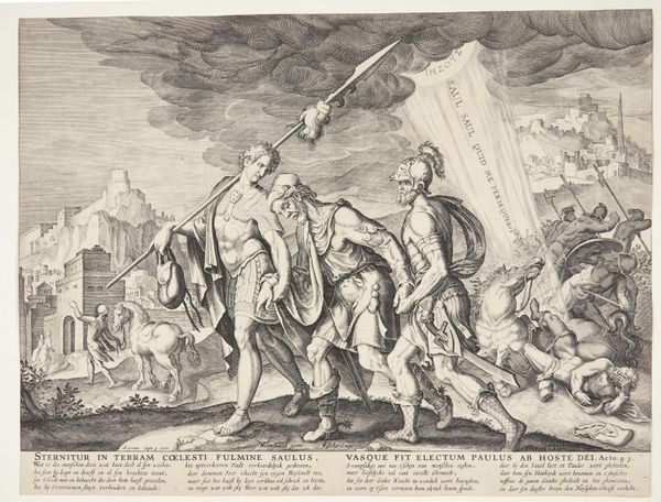Curator: Editor: This is Philips Galle’s engraving, “Bekering van Paulus,” from 1582, currently residing in the Rijksmuseum. The drama! The fall from the horse, the divine light... It feels very theatrical. How do you read this image? Curator: I see a powerful articulation of conversion, but through the lens of power and persecution. Galle isn’t simply depicting a religious awakening; he’s presenting a pivotal moment of ideological transformation. How do we reconcile Paul’s previous role as a persecutor with his sudden enlightenment? Consider the socio-political implications. Editor: It’s interesting to think about conversion as a form of ideological shift. I had focused on the visual drama, but your perspective opens it up. Were there specific societal tensions that Galle was reflecting? Curator: Absolutely. Consider the period: 16th-century Europe, rife with religious conflict. Galle, working within the Mannerist style, exaggerates the figures, the light, the chaos, mirroring the upheaval of the Reformation. This conversion narrative speaks to the anxieties around religious authority, the questioning of established dogma, and the individual’s relationship to belief systems. Paul’s conversion could symbolize the potential for even the most entrenched beliefs to be overturned, a prospect both hopeful and terrifying. Editor: So, the fall from the horse isn't just a physical event, but a symbolic dismantling of Paul’s former conviction. And the light, a disruptive force. It challenges viewers even today. Curator: Precisely! Think of light as a form of intervention, revealing the limitations of his previous worldview. What does it mean to have the ground quite literally pulled from beneath you? It encourages us to investigate those transformative moments, both personal and societal, that shake us to our core. Editor: This makes me consider religious artworks through such a different lens, beyond the piety they’re meant to evoke! Thank you for the conversation. Curator: My pleasure. It highlights the inherent dynamism of artworks when viewed from our respective positions in our particular moment.