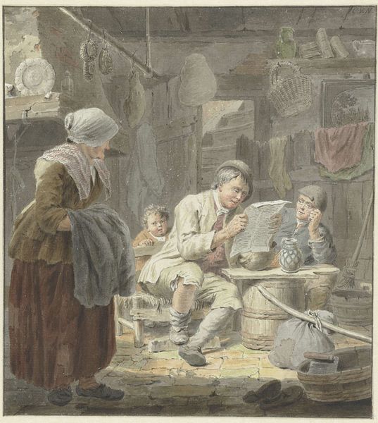 Curator: What strikes me first is the clear tension, the atmosphere. There’s a quiet disruption about to happen here. Editor: That's interesting. This work is titled “Three Drinking Farmers.” It's attributed to Aletta de Freij, and held in the Städel Museum. We think of it as part of the Baroque genre painting tradition. Curator: Baroque! Okay, yes, I can see the theatrics. And the figures. But they seem caught off guard. I find myself wondering who those farmers are—clearly reveling in something. Then that woman…her posture speaks volumes! The composition pushes us toward her, doesn't it? She seems less… boisterous than the lads. Editor: Right. Aletta definitely wanted to focus on contrasting moralities in everyday life. The lady in the doorway is positioned on the opposite side. And observe, how cleverly the composition leads the eyes through a contrast of dark vs light from left to right Curator: And that poor, poor hat, just askew on the chair as its owner sings. The shapes and the playfulness is so different with her direct glance, that stiffened pose in front of what must be the open doorway. I get the sense it's not just about documenting a scene. It feels loaded. Is that resentment or world-weariness on her face? Editor: It's a strong statement for sure. This piece, using tempera, lends a sort of understated look compared to how it may feel looking at this composition. But back to your point: the emotional depth is fascinating. Curator: Absolutely, I'm left with this unsettled feeling, like peeking into a private drama—one playing out in my own heart, too, perhaps. It is not very joyous despite what one may expect, knowing that the fellows are drinking Editor: Definitely a contrast and very revealing. I appreciate the focus on how even mundane depictions can reveal inner emotions. Curator: Indeed. Now I see Baroque paintings in a whole new, wonderfully weird light! Thank you for helping my appreciation for "Three Drinking Farmers," evolve. Editor: The pleasure's all mine, and I shall raise a glass—responsibly—to that.