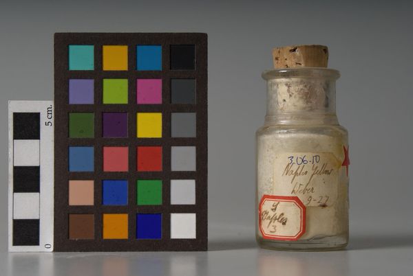 Editor: This object, titled "Copperas," was manufactured by Stillbecks. It looks like a simple glass bottle, but the handwritten label gives it so much character. What do you make of it? Curator: It's intriguing how a mundane object can become significant when viewed through a socio-historical lens. Copperas, or ferrous sulfate, was crucial for dyeing textiles. Editor: Dyeing textiles? Curator: Yes, think about the power dynamics inherent in textile production, from enslaved laborers cultivating raw materials to the fashion industry's exploitation of garment workers today. This bottle represents that whole system. What do you think about that? Editor: I never would have made that connection. Thanks for sharing this perspective. Curator: It's about recognizing the interwoven histories embedded in even the simplest objects.