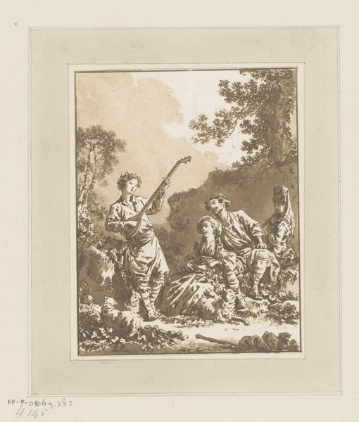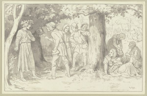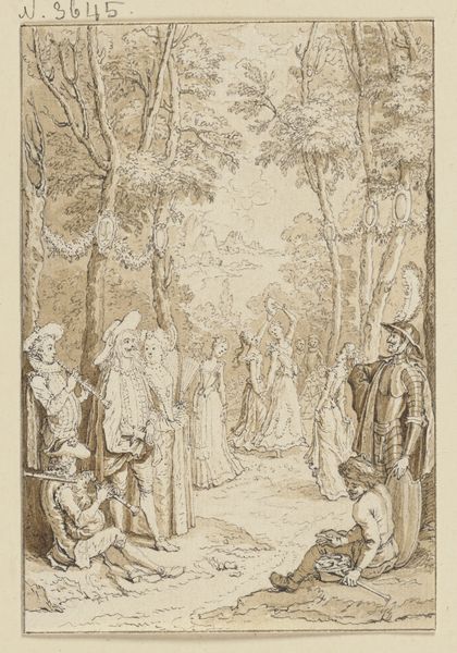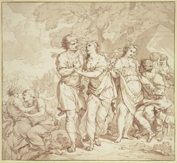This drawing, "Don Quixote beschützt Basilio," was made by Jacob Folkema in the 18th century with pen and brown ink, brush and gray wash over pencil. The artist skillfully uses line and wash to create a sense of depth and drama. Folkema would have begun with a light pencil sketch, over which he laid precise pen work, defining the contours of the figures and landscape. The brown ink provides contrast and shadow, while the gray wash softens the forms and creates an atmospheric effect. Paper, ink, and graphite pencils were becoming increasingly available during this time, thanks to innovations in manufacturing. The artist's ability to manipulate these humble materials, imbuing them with life and emotion, elevates the drawing beyond its basic components. It reminds us that true artistry lies not just in the materials used, but in the skill and imagination of the maker.