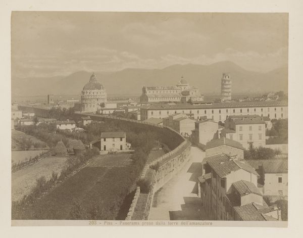 Curator: The photograph we are viewing is entitled "Gezicht op de Ka'aba in de Al-Masjid al-Haram in Mekka," which translates to "View of the Ka'aba in the Great Mosque of Mecca." This gelatin silver print, showcasing a landscape perspective, was captured by Abd al-Ghaffar in 1889. Editor: It's strikingly formal and austere. The photograph uses a very high vantage point to capture the Kaaba within its urban setting; everything seems very regimented and still. Curator: Absolutely. Photography in this era often carried the weight of documentation, particularly in the context of Orientalism. It was as much about observing as it was about archiving, and about placing on display an aesthetic, almost an obsession with order, that reinforced colonial expectations and social power. Editor: Indeed. The Ka'aba itself, as a powerful symbol of spiritual unity, appears almost minimized here by the city sprawling around it. What resonates with me is how that iconic form is rendered within an impersonal, encompassing view. One could argue, in this way, that its sanctity gets reinterpreted and recontextualized for those of different cultural and religious beliefs to the point it has almost another function in this presentation, that it becomes simply part of another city panorama. Curator: It underscores how such visual representations could, perhaps inadvertently, flatten complex spiritual realities, turning them into digestible, if sometimes superficial, consumable views for a Western audience, and in doing so further legitimized photography as tool for social control. Editor: The lack of human presence, paradoxically, makes the site feel somewhat empty, despite its profound spiritual importance. Is this because of the photographic limitations of the era or is it intentional? Does it have something to do with power? Curator: Probably a combination of technical constraints and conscious aesthetic choices rooted in prevailing cultural views on Islamic art and orientalism. Abd al-Ghaffar would likely have considered how his work fitted into established artistic styles that dominated his target market. Editor: Well, seeing how that symbolism shifts across eras and cultural landscapes has offered a refreshing perspective on this photograph. Curator: Indeed, seeing beyond that static first impression reveals complex considerations that can shape a work's legacy across history and geographies.