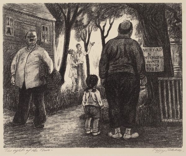 Curator: Let's talk about Bernarda Bryson's "Arkansas Sharecroppers," created between 1935 and 1936. It's a graphite drawing, rendered as a print. Editor: First impression? Bleak. Absolutely, soul-crushingly bleak. The whole composition seems to sag, burdened by… well, life, I suppose. Curator: Bryson, affiliated with the Ashcan School, clearly positions this within a social realism context. Her focus is on portraying the hardships endured during the Depression. Editor: Hardships isn’t the half of it. Look at their faces. Defeated, yet something resilient flickers in their eyes, you know? And those cotton plants look sinister somehow, not the romantic vision we're fed in history books. Curator: Indeed. Notice the use of graphite—the deliberate mark-making. The artist’s hand is very present. She chose printmaking techniques to reach a wider audience, reflecting a desire to raise social awareness about the economic conditions. The number "666" emblazoned on a sign referring to malaria outbreaks… it’s potent symbolism. Editor: Totally agree, the medium conveys a lot of meaning. That sign, though. “Malaria, chills, fever.” Like an omen hanging over them, a curse attached to the very land. There is something surreal about its repetitive appearance. It’s the land they depend on also betraying them, literally sickening them. And beyond this idea, her way to represent these folks and their living spaces using pencil drawings adds intimacy, almost forcing us to confront them. Curator: The work serves as a historical document of the era. Consider the material conditions: sharecropping, exploitation, disease, lack of resources. All deeply embedded in the means of production and how that affected these people. Editor: Absolutely, it’s a testament to resilience but a brutal indictment of a system designed to keep them down. Her use of graphite creates an image that can simultaneously communicate tenderness and raw misery. It is also the ability to look directly at something painful. I mean, how do you create such intense emotion with graphite and paper? Curator: Bryson's background and involvement with the WPA further contextualizes her work, which sought to validate the labor and experiences of everyday Americans. Editor: Right. Thinking about it, her perspective… it's a challenge to historical narratives. Powerful. This seemingly simple drawing carries an emotional weight that makes it unforgettable.
