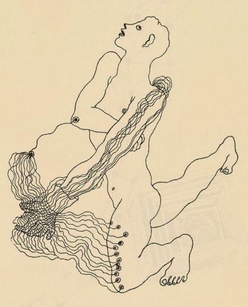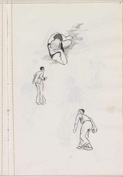 Editor: This is Eric Gill's "Border: Chaucer & Cupid, and Chaucer Writing" at the Tate. The stark lines and simple figures give it such a modern feel, even though it depicts a medieval subject. What cultural echoes do you hear when you look at this piece? Curator: Notice how Gill renders Chaucer, not as a specific portrait, but as an archetype of the inspired poet. The Cupid figure on his shoulder alludes to divine inspiration, a common trope linking creativity to a higher power. Does it remind you of classical depictions of muses, perhaps? Editor: Yes, I see what you mean! The Cupid feels almost like a little muse whispering in his ear. Curator: Exactly. And the act of writing itself, carefully rendered, suggests the painstaking process of creation, elevating the written word. A powerful combination of the profane and the divine, wouldn't you agree? Editor: Definitely. It's amazing how much meaning is packed into such a simple image.