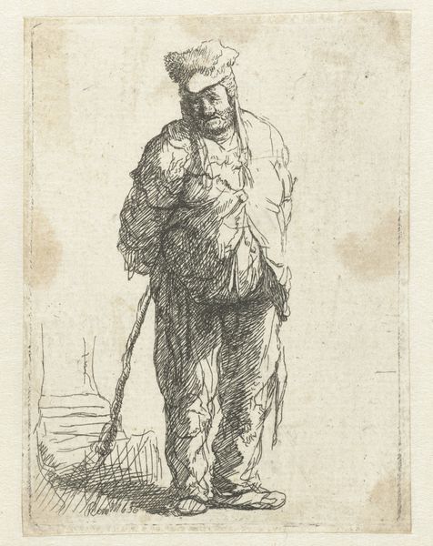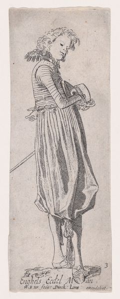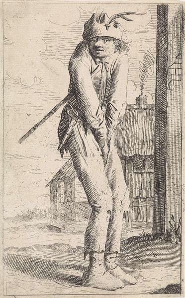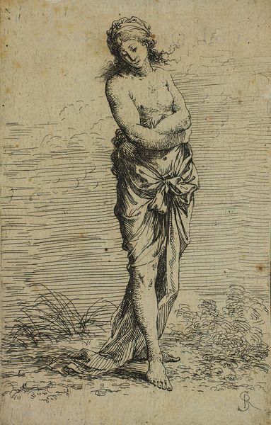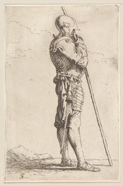 Editor: We’re looking at "Standing Warrior with Shield," an engraving made around 1657 by Salvator Rosa. There's this kind of vulnerable quality to the figure that feels unexpected in a warrior, given the traditional armour and all. What strikes you most about this image? Curator: It is striking, isn't it? What gets me is how Rosa uses the stark lines of the engraving to evoke not just form but also…a world-weariness, perhaps? Look at the posture: He leans heavily on that shield. Rosa was an interesting one; always straddling lines between different worlds – theatricality and melancholy, the epic and the intimate. Do you sense a narrative in it, even without knowing any historical context? Editor: Absolutely. The shield, though central, has a simple ornamentation, almost faded. Is it intended to tell us something specific? Curator: Ah, the shield! Think of it as a prop in Rosa's play. While a decorated shield could scream family crest or battlefield victories, this one whispers a personal story. Maybe even doubts or fatigue. Editor: It really changes how I see it. It goes from a depiction of strength to maybe questioning it? Curator: Exactly. Rosa often painted banditti, soldiers, outcasts…figures at the margins of society and their time. He seems less interested in glorifying battle and more so in capturing a moment of…humanity. What do you take away from Rosa's choices in depicting a “warrior”? Editor: It challenges what it means to portray power. Maybe courage isn't about strength, but the weight we carry doing what we need to do. Curator: Precisely. Rosa gets us to think about the space between perception and reality. Between the stories we tell, and the reality of our own existence.