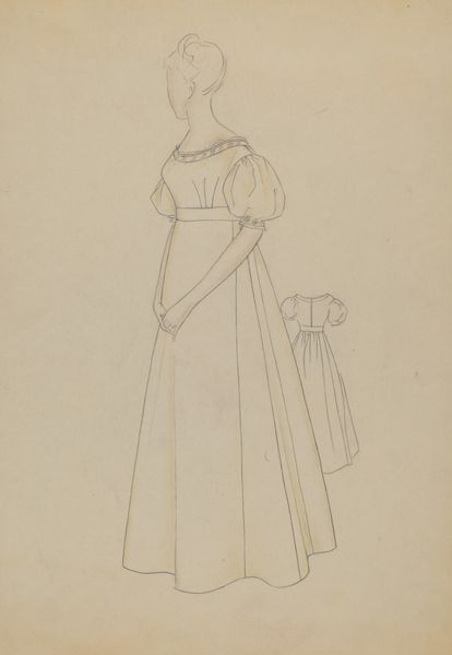 Editor: Here we have "Dress", a drawing on paper made sometime between 1935 and 1942 by Julie C. Brush. The lines are so clean; it gives the piece a simultaneously modern and vintage feel. What jumps out at you? Curator: It whispers of old photographs found in attics, doesn’t it? Think about the 1930s, between world wars. Fashion was shedding its flapper skin, yearning for elegance and… restraint. This isn’t just a dress; it’s a captured moment, an echo of societal shifts. Does it feel hopeful or subdued to you? Editor: Subdued, definitely. Almost like a memory fading at the edges. It also looks incomplete somehow. Curator: Precisely! The linework—notice how spare it is. Brush is interested in the essential form, not embellishment. I wonder, is she showing us the Platonic ideal of a dress? Or perhaps hinting at the dress’s absence of the wearer? Editor: An absence? That's an interesting idea! It does feel ghostly without a body to fill it. Curator: Fashion plates, particularly those on paper, exist at a remove. Unlike a painting they gesture to use more so than immediate contemplation. We often focus on clothing as a means of individualization, but consider its flip-side in industrial construction. How are the wearer, artist and object unified in these forms of mass-production? Does such activity enhance or dampen a personal spirit? Editor: I hadn't thought of it that way, as a blueprint for mass-production! Now I’m seeing layers of meaning, beyond just a pretty dress. It feels heavier, more significant somehow. Curator: The beauty of art! It invites us to question, reinterpret, and see beyond the surface. Each glance unveils another secret, or maybe, a shared experience reflected back at us. Editor: This was amazing, I’ll never look at fashion drawing the same way again! Thanks!